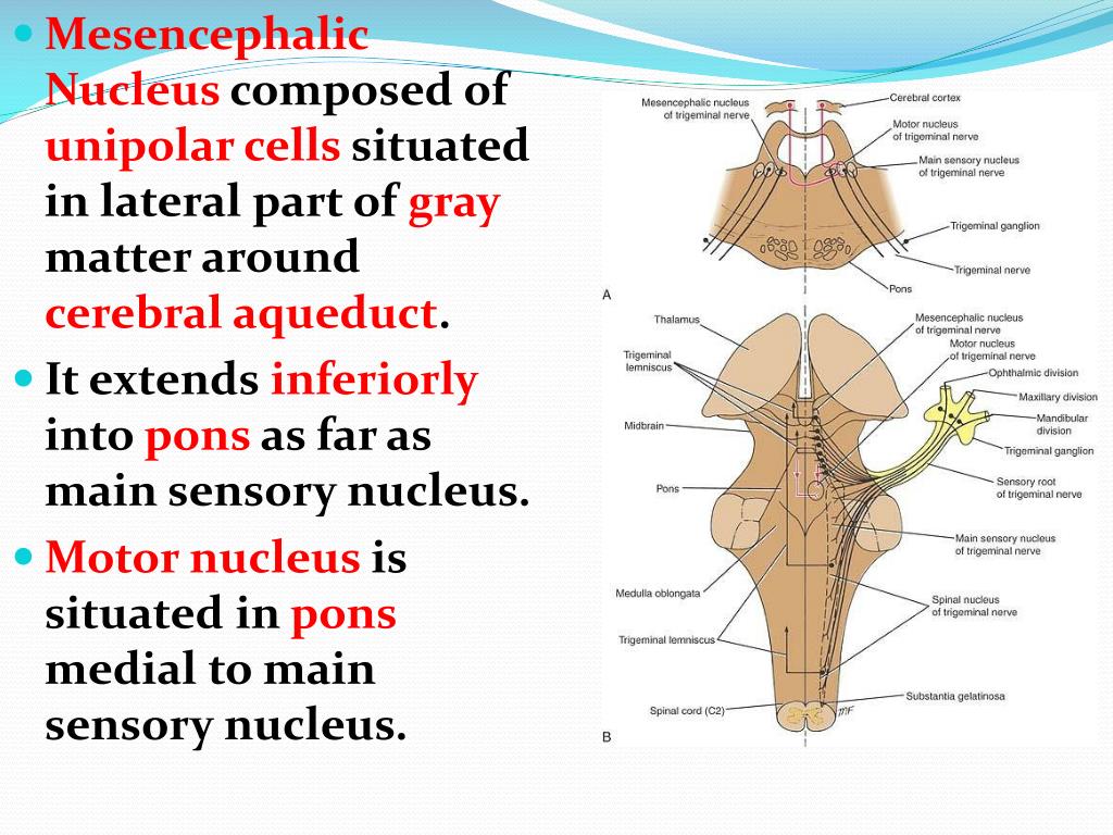 Mesencephalic Nucleus composed of unipolar cells situated in lateral part of gray matter around cerebral aqueduct. • It extends inferiorly into pons as far as main sensory nucleus. • Motor nucleus is situated in ponsmedial to main sensory nucleus.