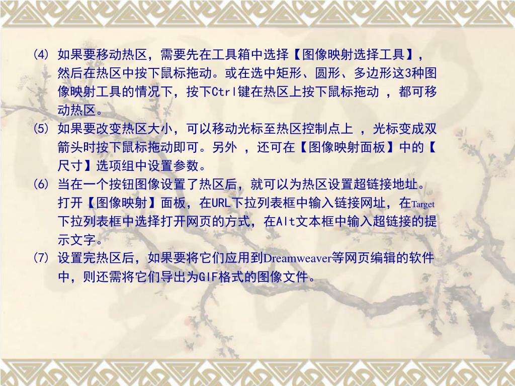 (4) 如果要移动热区,需要先在工具箱中选择【图像映射选择工具】, 然后在热区中按下鼠标拖动。或在选中矩形、圆形、多边形这3种图 像映射工具的情况下,按下Ctrl键在热区上按下鼠标拖动 ,都可移 动热区。 (5) 如果要改变热区大小,可以移动光标至热区控制点上 ,光标变成双 箭头时按下鼠标拖动即可。另外 ,还可在【图像映射面板】中的【 尺寸】选项组中设置参数。 (6) 当在一个按钮图像设置了热区后,就可以为热区设置超链接地址。 打开【图像映射】面板,在URL下拉列表框中输入链接网址,在Target 下拉列表框中选择打开网页的方式,在Alt文本框中输入超链接的提 示文字。 (7) 设置完热区后,如果要将它们应用到Dreamweaver等网页编辑的软件 中,则还需将它们导出为GIF格式的图像文件。