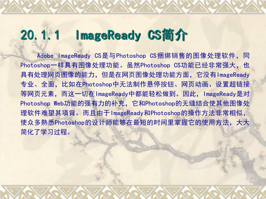20.1.1 ImageReady CS简介 Adobe ImageReady CS是与Photoshop CS捆绑销售的图像处理软件,同Photoshop一样具有图像处理功能。虽然Photoshop CS功能已经非常强大,也具有处理网页图像的能力,但是在网页图像处理功能方面,它没有ImageReady专业、全面,比如在Photoshop中无法制作悬停按钮、网页动画、设置超链接等网页元素,而这一切在ImageReady中都能轻松做到。因此,ImageReady是对Photoshop Web功能的强有力的补充,它和Photoshop的无缝结合使其他图像处理软件难望其项背。而且由于ImageReady和Photoshop的操作方法非常相似,使众多熟悉Photoshop的设计师能够在最短的时间里掌握它的使用方法,大大简化了学习过程。