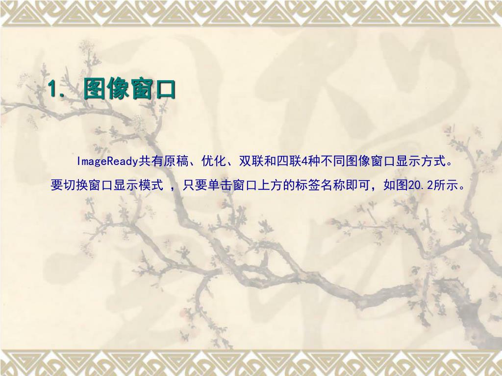 1. 图像窗口 ImageReady共有原稿、优化、双联和四联4种不同图像窗口显示方式。要切换窗口显示模式 ,只要单击窗口上方的标签名称即可,如图20.2所示。