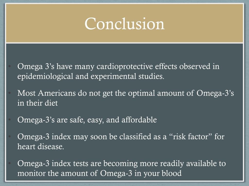 Conclusion • Omega 3’s have many cardioprotective effects observed in epidemiological and experimental studies. • Most Americans do not get the optimal amount of Omega-3’s in their diet • Omega-3’s are safe, easy, and affordable • Omega-3 index may soon be classified as a “risk factor” for heart disease. • Omega-3 index tests are becoming more readily available to monitor the amount of Omega-3 in your blood