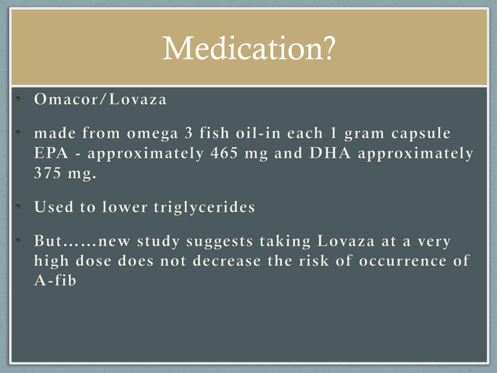 Medication? • Omacor/Lovaza • made from omega 3 fish oil-in each 1 gram capsule EPA - approximately 465 mg and DHA approximately 375 mg. • Used to lower triglycerides • But……new study suggests taking Lovaza at a very high dose does not decrease the risk of occurrence of A-fib