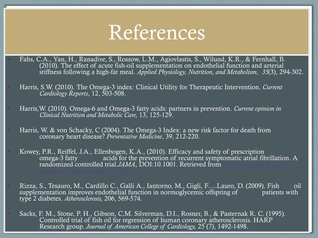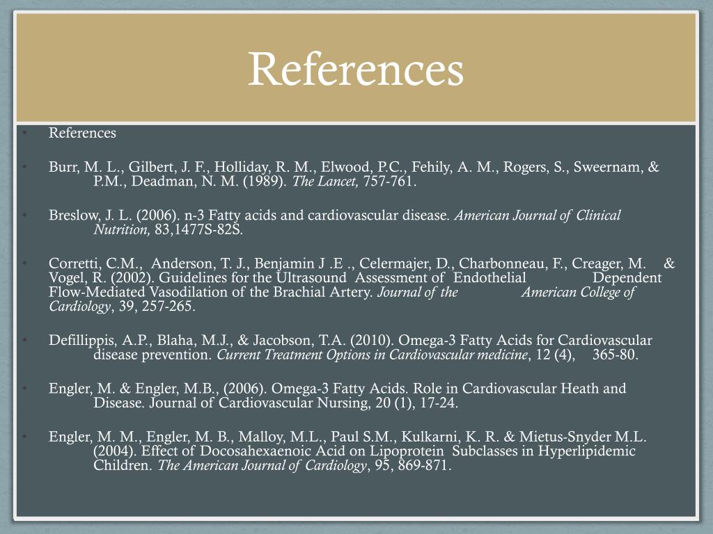 References • References • Burr, M. L., Gilbert, J. F., Holliday, R. M., Elwood, P.C., Fehily, A. M., Rogers, S., Sweernam, & P.M., Deadman, N. M. (1989). The Lancet, 757-761. • Breslow, J. L. (2006). n-3 Fatty acids and cardiovascular disease. American Journal of Clinical Nutrition, 83,1477S-82S. • Corretti, C.M., Anderson, T. J., Benjamin J .E ., Celermajer, D., Charbonneau, F., Creager, M. & Vogel, R. (2002). Guidelines for the Ultrasound Assessment of Endothelial Dependent Flow-Mediated Vasodilation of the Brachial Artery. Journal of the American College of Cardiology, 39, 257-265. • Defillippis, A.P., Blaha, M.J., & Jacobson, T.A. (2010). Omega-3 Fatty Acids for Cardiovascular disease prevention. Current Treatment Options in Cardiovascular medicine, 12 (4), 365-80. • Engler, M. & Engler, M.B., (2006). Omega-3 Fatty Acids. Role in Cardiovascular Heath and Disease. Journal of Cardiovascular Nursing, 20 (1), 17-24. • Engler, M. M., Engler, M. B., Malloy, M.L., Paul S.M., Kulkarni, K. R. & Mietus-Snyder M.L. (2004). Effect of Docosahexaenoic Acid on Lipoprotein Subclasses in Hyperlipidemic Children. The American Journal of Cardiology, 95, 869-871.