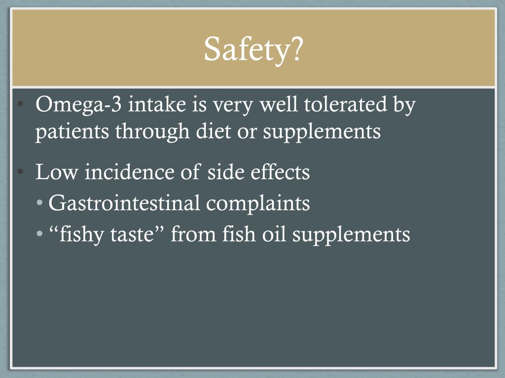 Safety? • Omega-3 intake is very well tolerated by patients through diet or supplements • Low incidence of side effects • Gastrointestinal complaints • “fishy taste” from fish oil supplements