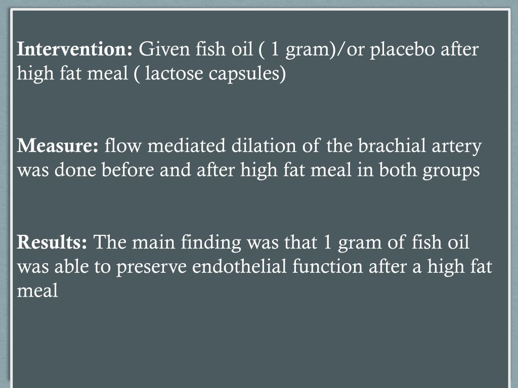 Intervention: Given fish oil ( 1 gram)/or placebo after high fat meal ( lactose capsules) Measure: flow mediated dilation of the brachial artery was done before and after high fat meal in both groups Results: The main finding was that 1 gram of fish oil was able to preserve endothelial function after a high fat meal