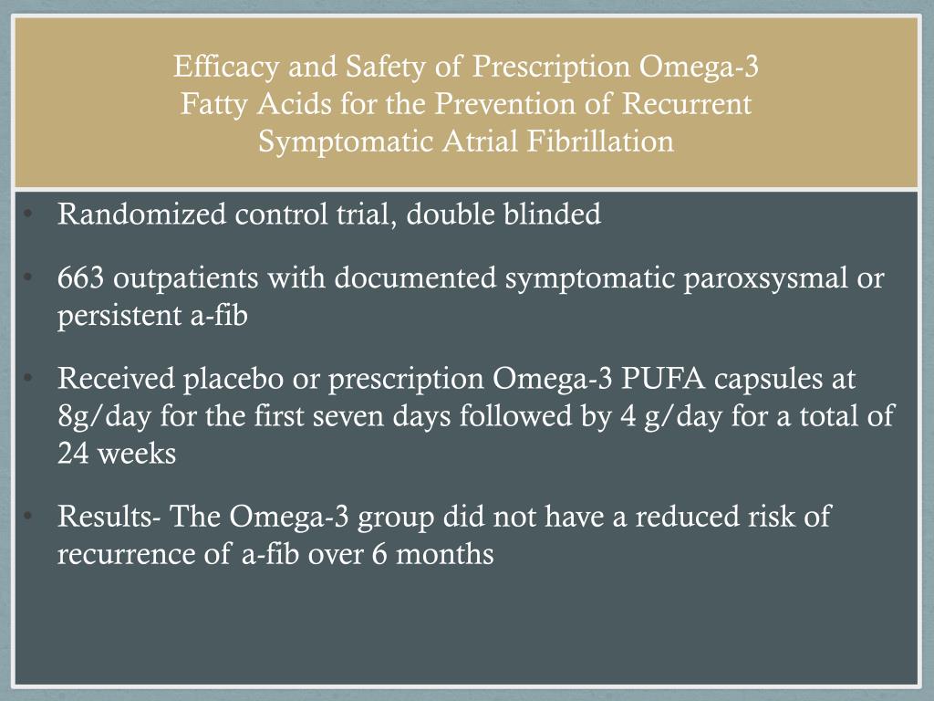 Efficacy and Safety of Prescription Omega-3Fatty Acids for the Prevention of RecurrentSymptomatic Atrial Fibrillation • Randomized control trial, double blinded • 663 outpatients with documented symptomatic paroxsysmal or persistent a-fib • Received placebo or prescription Omega-3 PUFA capsules at 8g/day for the first seven days followed by 4 g/day for a total of 24 weeks • Results- The Omega-3 group did not have a reduced risk of recurrence of a-fib over 6 months