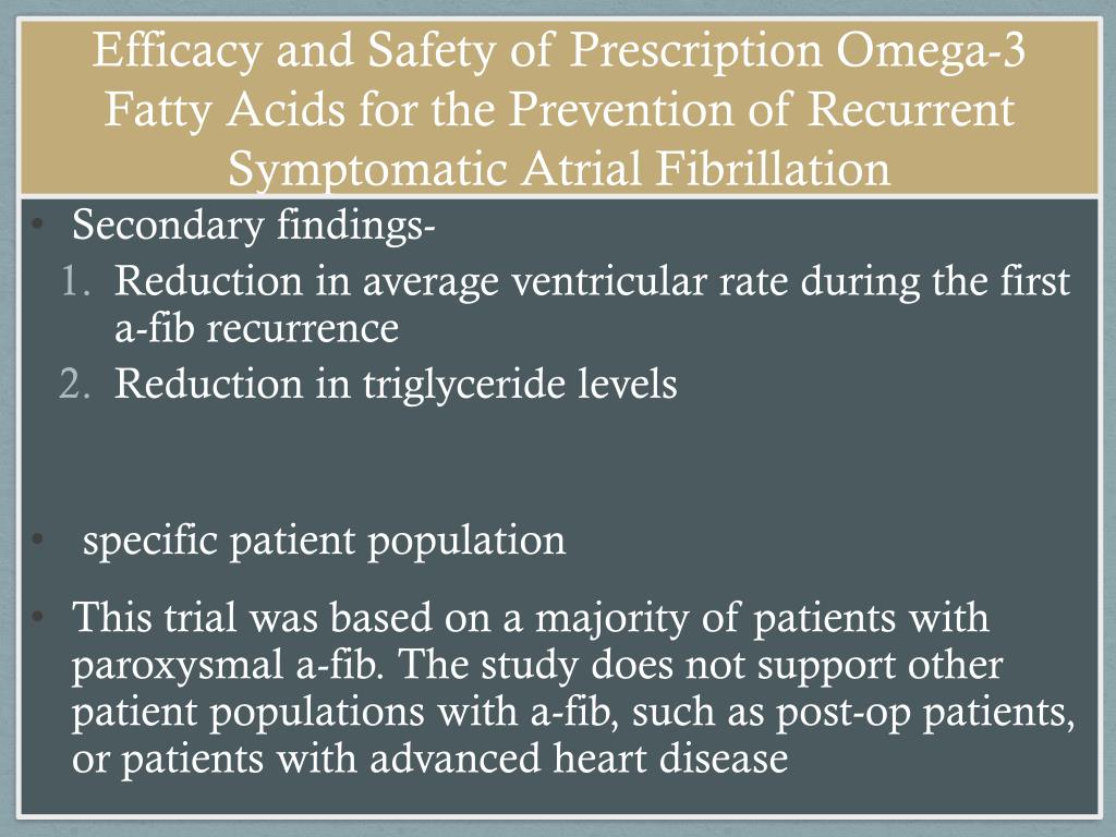 Efficacy and Safety of Prescription Omega-3Fatty Acids for the Prevention of RecurrentSymptomatic Atrial Fibrillation • Secondary findings- • Reduction in average ventricular rate during the first a-fib recurrence • Reduction in triglyceride levels • specific patient population • This trial was based on a majority of patients with paroxysmal a-fib. The study does not support other patient populations with a-fib, such as post-op patients, or patients with advanced heart disease