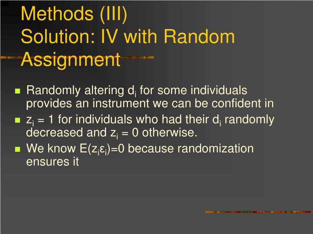 Methods (III)Solution: IV with Random Assignment • Randomly altering di for some individuals provides an instrument we can be confident in • zi = 1 for individuals who had their di randomly decreased and zi = 0 otherwise. • We know E(ziεi)=0 because randomization ensures it