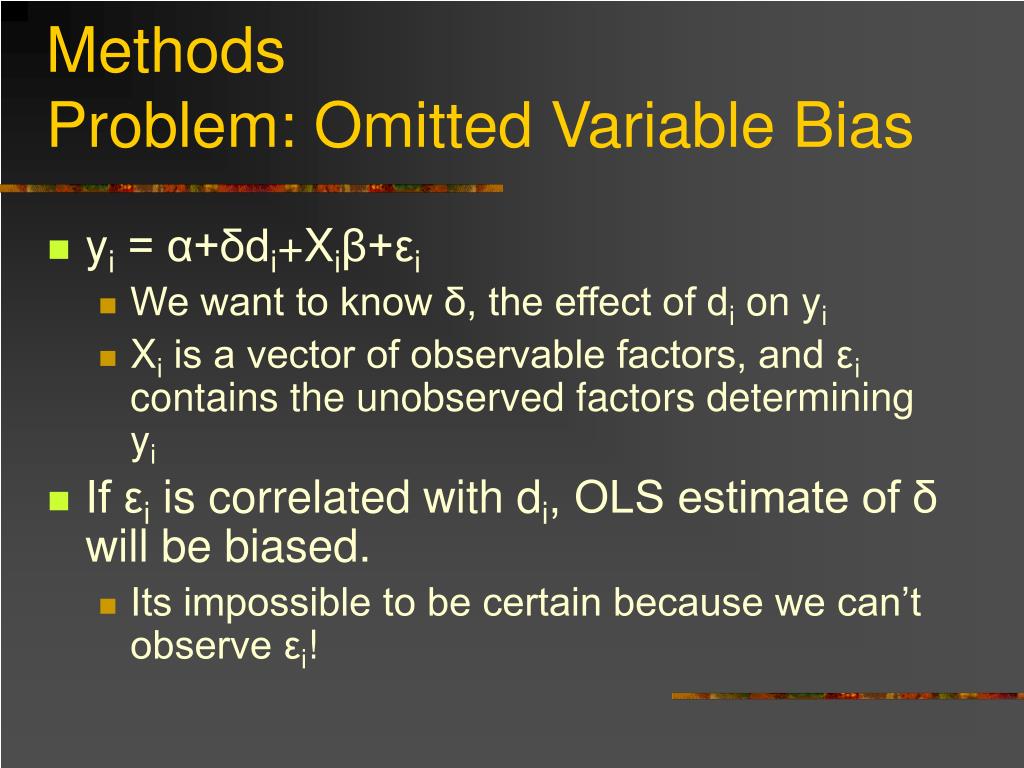 MethodsProblem: Omitted Variable Bias • yi = α+δdi+Xiβ+εi • We want to know δ, the effect of di on yi • Xi is a vector of observable factors, and εi contains the unobserved factors determining yi • If εi is correlated with di, OLS estimate of δ will be biased. • Its impossible to be certain because we can’t observe εi!