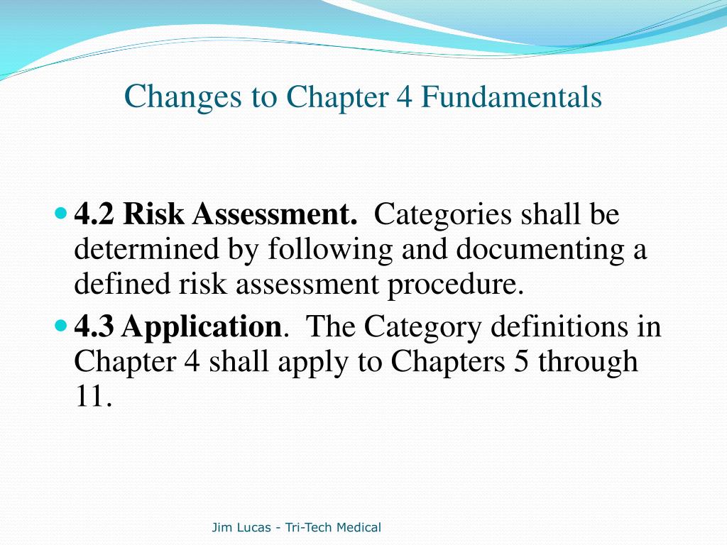 Changes to Chapter 4 Fundamentals • 4.2 Risk Assessment. Categories shall be determined by following and documenting a defined risk assessment procedure. • 4.3 Application. The Category definitions in Chapter 4 shall apply to Chapters 5 through 11. Jim Lucas - Tri-Tech Medical