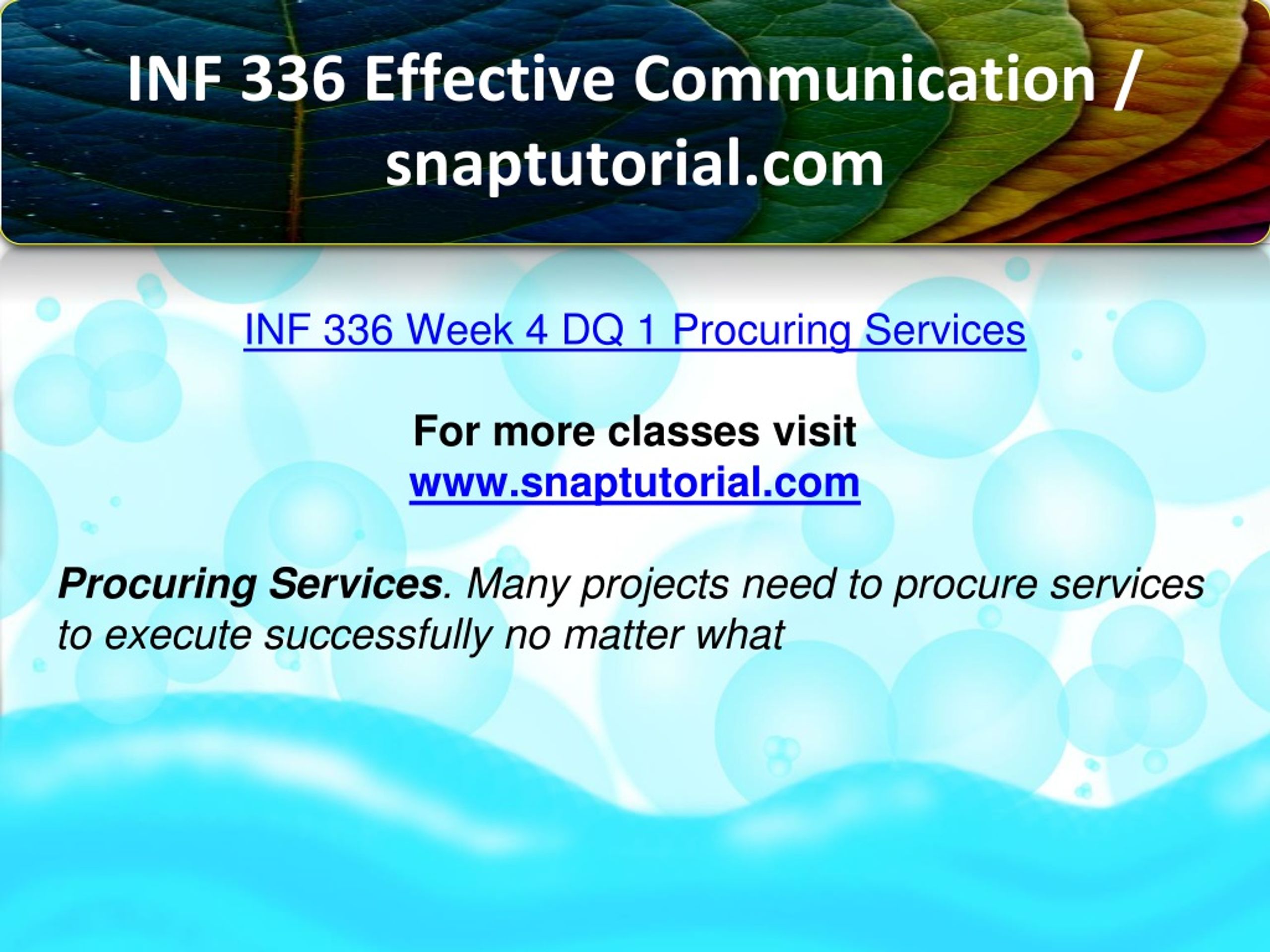 INF 336 Effective Communication / snaptutorial.com INF 336 Week 4 DQ 1 Procuring Services For more classes visit www.snaptutorial.com Procuring Services. Many projects need to procure services to execute successfully no matter what