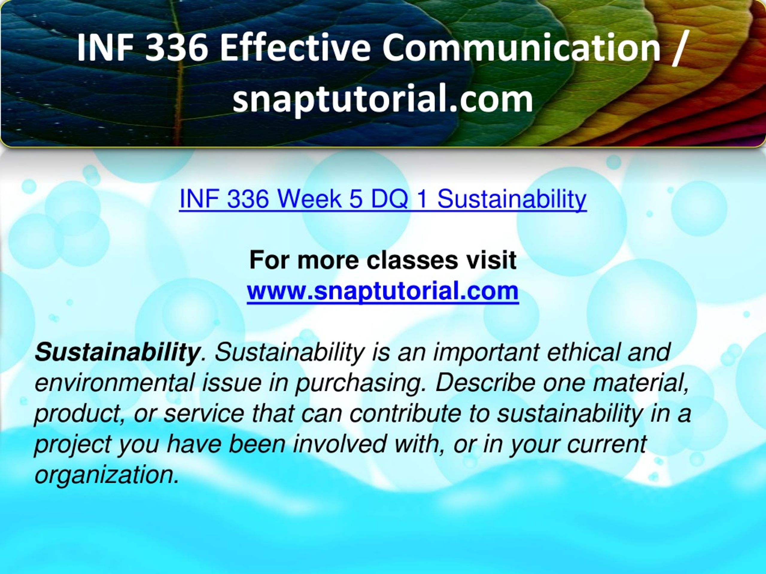 INF 336 Effective Communication / snaptutorial.com INF 336 Week 5 DQ 1 Sustainability For more classes visit www.snaptutorial.com Sustainability. Sustainability is an important ethical and environmental issue in purchasing. Describe one material, product, or service that can contribute to sustainability in a project you have been involved with, or in your current organization.