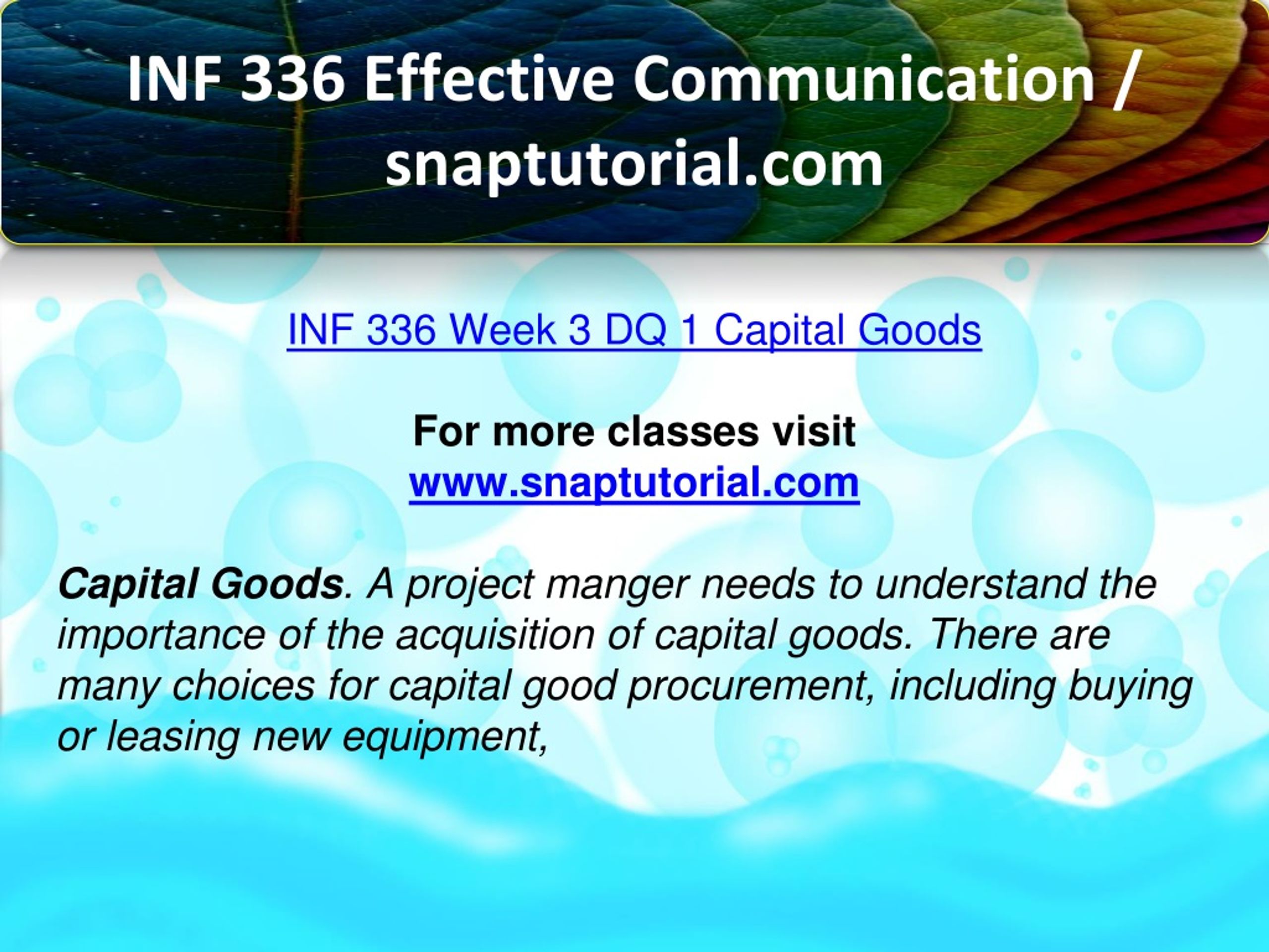 INF 336 Effective Communication / snaptutorial.com INF 336 Week 3 DQ 1 Capital Goods For more classes visit www.snaptutorial.com Capital Goods. A project manger needs to understand the importance of the acquisition of capital goods. There are many choices for capital good procurement, including buying or leasing new equipment,