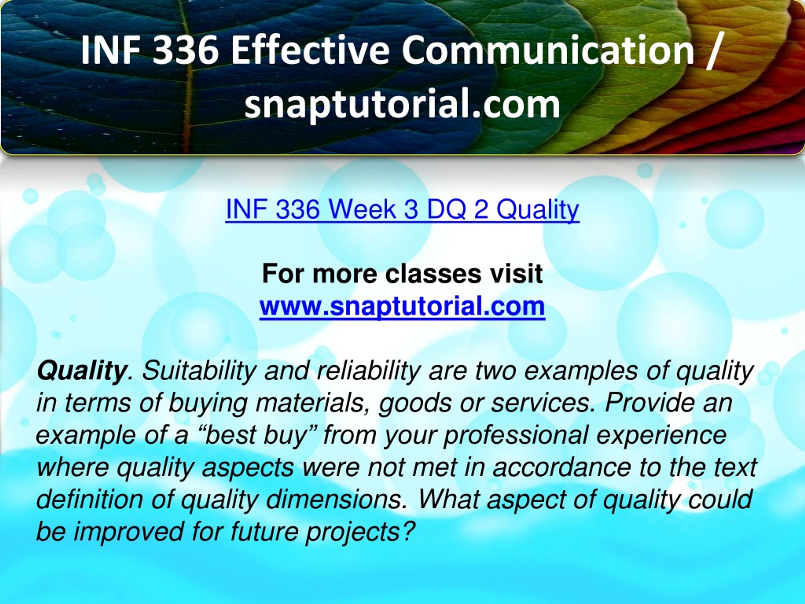 INF 336 Effective Communication / snaptutorial.com INF 336 Week 3 DQ 2 Quality For more classes visit www.snaptutorial.com Quality. Suitability and reliability are two examples of quality in terms of buying materials, goods or services. Provide an example of a “best buy” from your professional experience where quality aspects were not met in accordance to the text definition of quality dimensions. What aspect of quality could be improved for future projects?