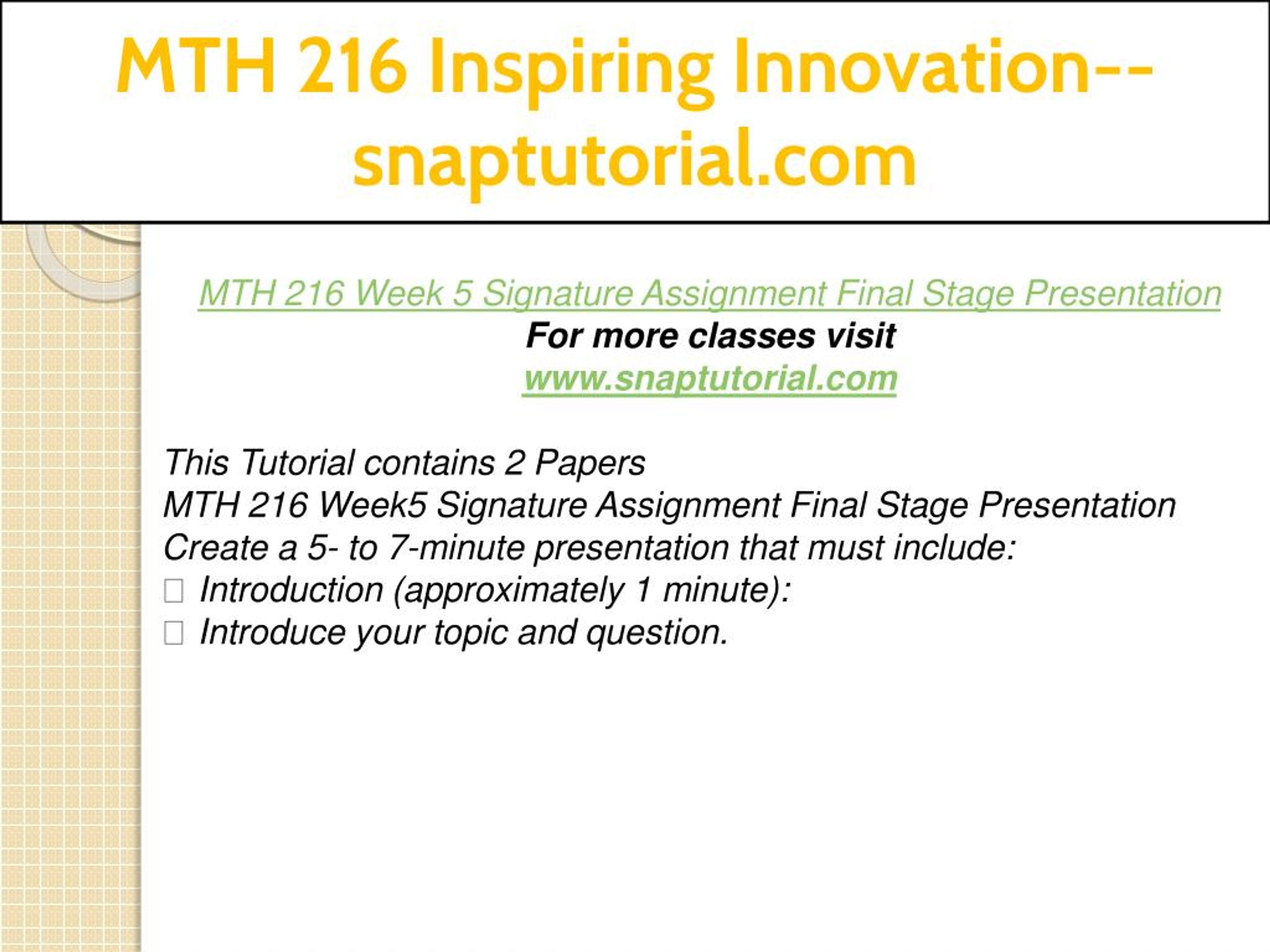 MTH 216 Inspiring Innovation--snaptutorial.com MTH 216 Week 5 Signature Assignment Final Stage Presentation For more classes visit www.snaptutorial.com This Tutorial contains 2 Papers MTH 216 Week5 Signature Assignment Final Stage Presentation Create a 5- to 7-minute presentation that must include: Introduction (approximately 1 minute): Introduce your topic and question.