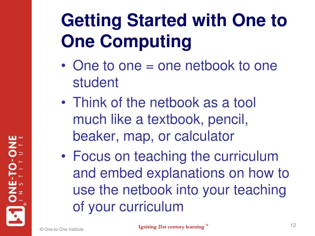 Getting Started with One to One Computing • One to one = one netbook to one student • Think of the netbook as a tool much like a textbook, pencil, beaker, map, or calculator • Focus on teaching the curriculum and embed explanations on how to use the netbook into your teaching of your curriculum