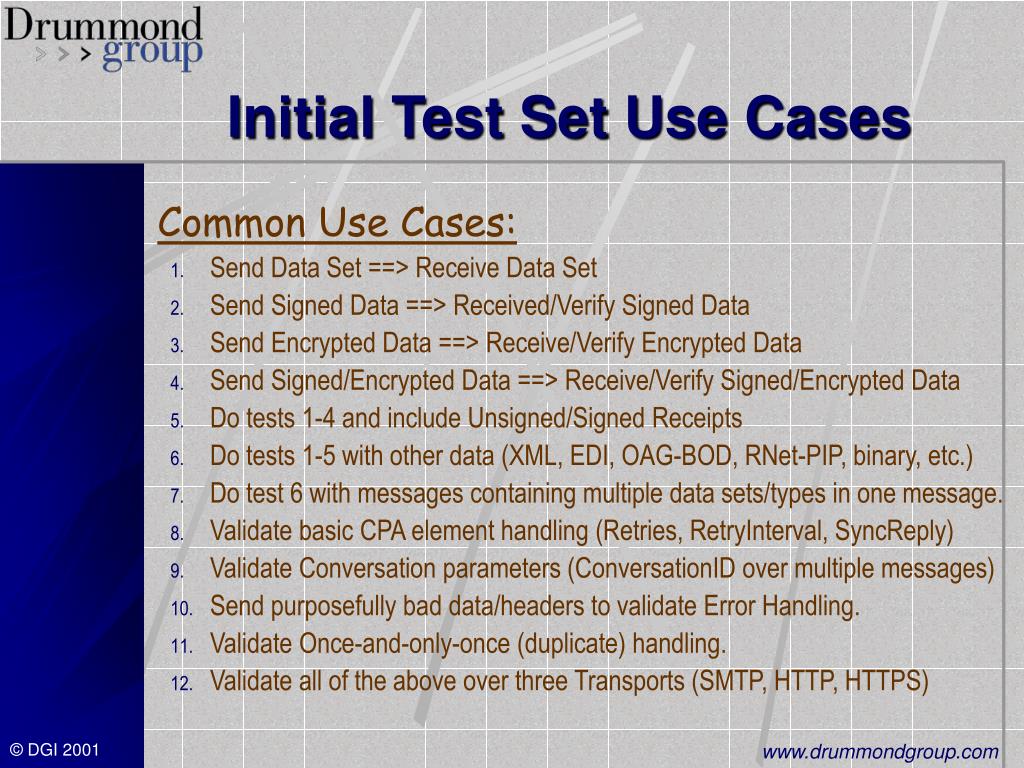 Initial Test Set Use Cases Common Use Cases: • Send Data Set ==> Receive Data Set • Send Signed Data ==> Received/Verify Signed Data • Send Encrypted Data ==> Receive/Verify Encrypted Data • Send Signed/Encrypted Data ==> Receive/Verify Signed/Encrypted Data • Do tests 1-4 and include Unsigned/Signed Receipts • Do tests 1-5 with other data (XML, EDI, OAG-BOD, RNet-PIP, binary, etc.) • Do test 6 with messages containing multiple data sets/types in one message. • Validate basic CPA element handling (Retries, RetryInterval, SyncReply) • Validate Conversation parameters (ConversationID over multiple messages) • Send purposefully bad data/headers to validate Error Handling. • Validate Once-and-only-once (duplicate) handling. • Validate all of the above over three Transports (SMTP, HTTP, HTTPS) www.drummondgroup.com
