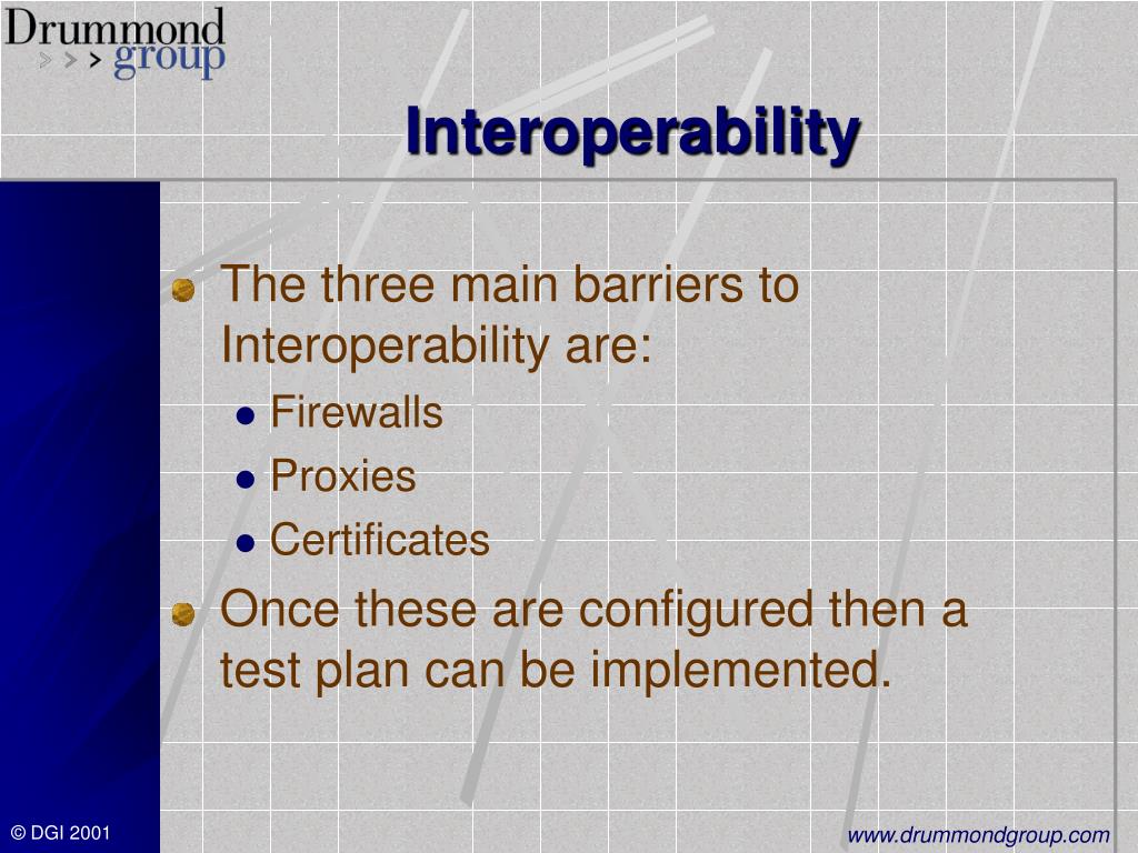Interoperability • The three main barriers to Interoperability are: • Firewalls • Proxies • Certificates • Once these are configured then a test plan can be implemented. www.drummondgroup.com