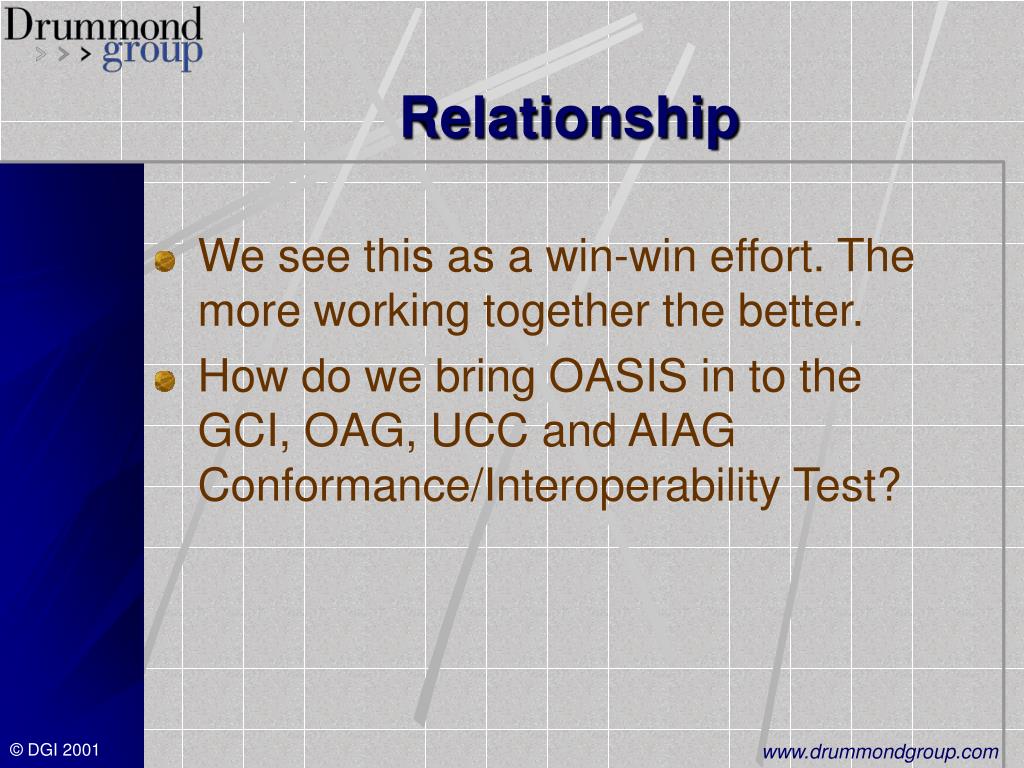 Relationship • We see this as a win-win effort. The more working together the better. • How do we bring OASIS in to the GCI, OAG, UCC and AIAG Conformance/Interoperability Test? www.drummondgroup.com