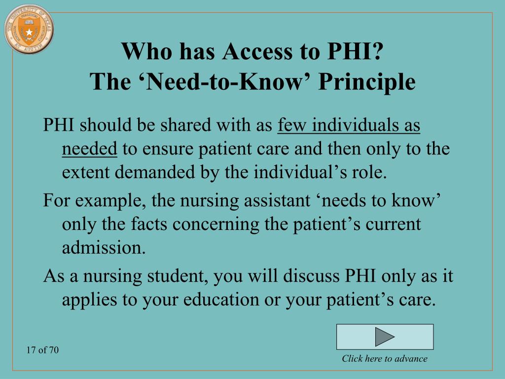 Who has Access to PHI?The ‘Need-to-Know’ Principle PHI should be shared with as few individuals as needed to ensure patient care and then only to the extent demanded by the individual’s role. For example, the nursing assistant ‘needs to know’ only the facts concerning the patient’s current admission. As a nursing student, you will discuss PHI only as it applies to your education or your patient’s care. Click here to advance