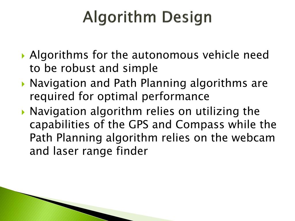 Algorithm Design • Algorithms for the autonomous vehicle need to be robust and simple • Navigation and Path Planning algorithms are required for optimal performance • Navigation algorithm relies on utilizing the capabilities of the GPS and Compass while the Path Planning algorithm relies on the webcam and laser range finder
