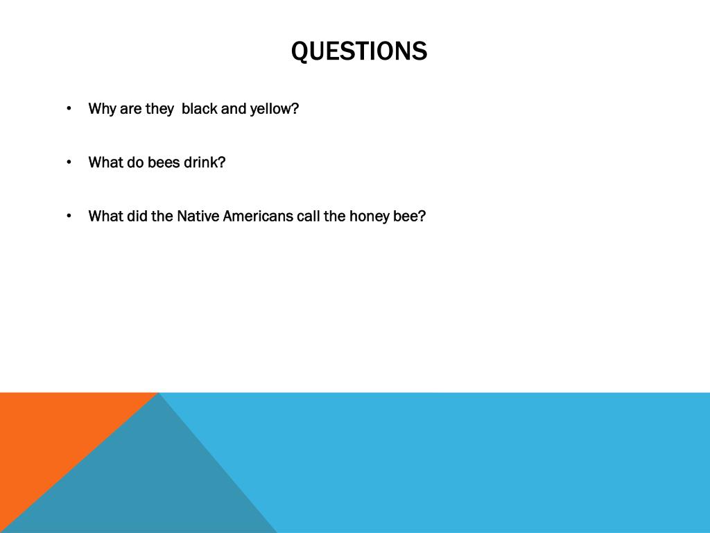 questions • Why are they black and yellow? • What do bees drink? • What did the Native Americans call the honey bee?