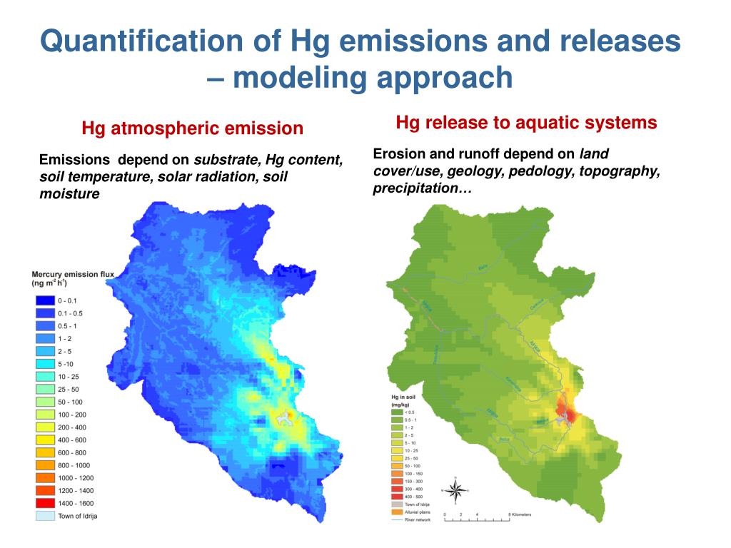 Quantification of Hg emissionsandreleases – modeling approach Hgrelease to aquaticsystems Erosion and runoff depend on land cover/use, geology, pedology, topography, precipitation… Hgatmosphericemission Emissions depend on substrate, Hg content, soil temperature, solar radiation, soil moisture