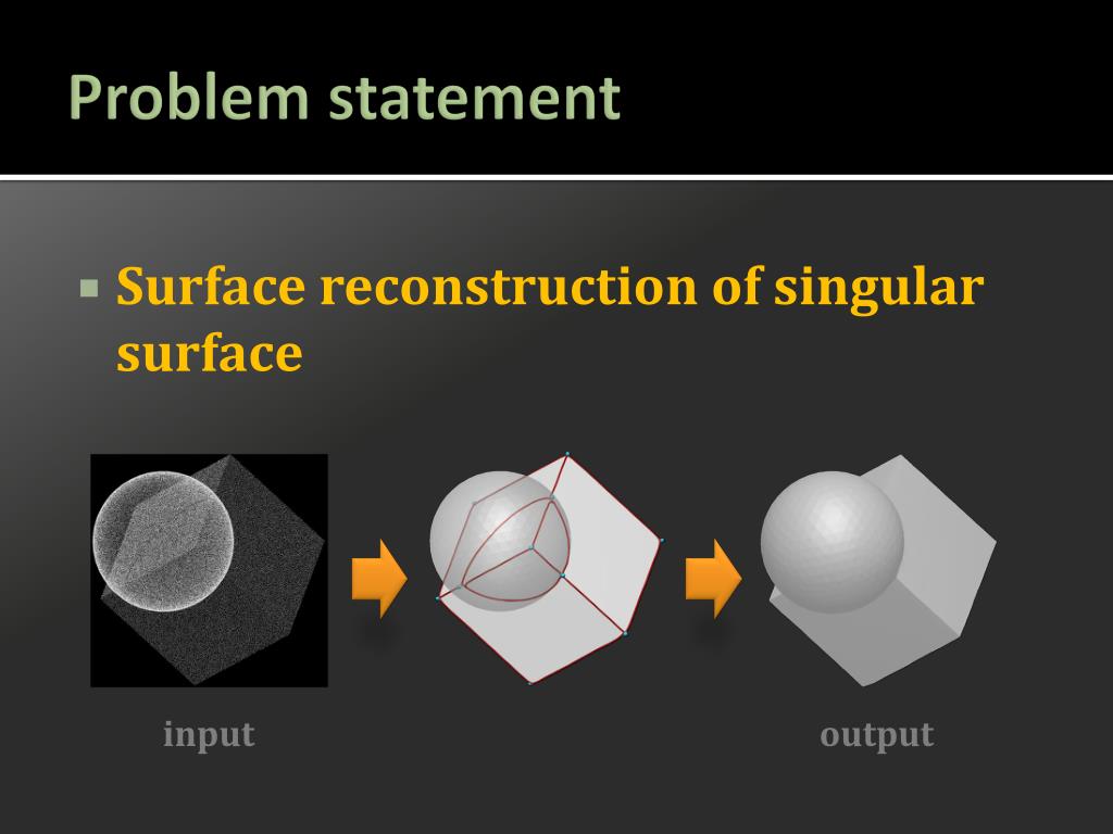 with Tamal Dey , Qichao Que , Issam Safa , Lei Wang, Yusu Wang Computer science and Engineering The Ohio State University. Feature-Preserving Reconstruction of Singular Surfaces. Xiaoyin Ge. Problem statement. Surface reconstruction of singular surface. input. output.