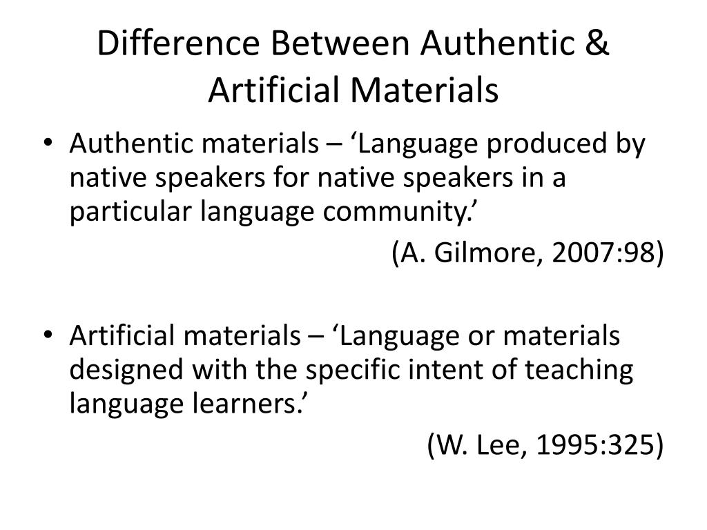 Difference Between Authentic & Artificial Materials • Authentic materials – ‘Language produced by native speakers for native speakers in a particular language community.’ (A. Gilmore, 2007:98) • Artificial materials – ‘Language or materials designed with the specific intent of teaching language learners.’ (W. Lee, 1995:325)