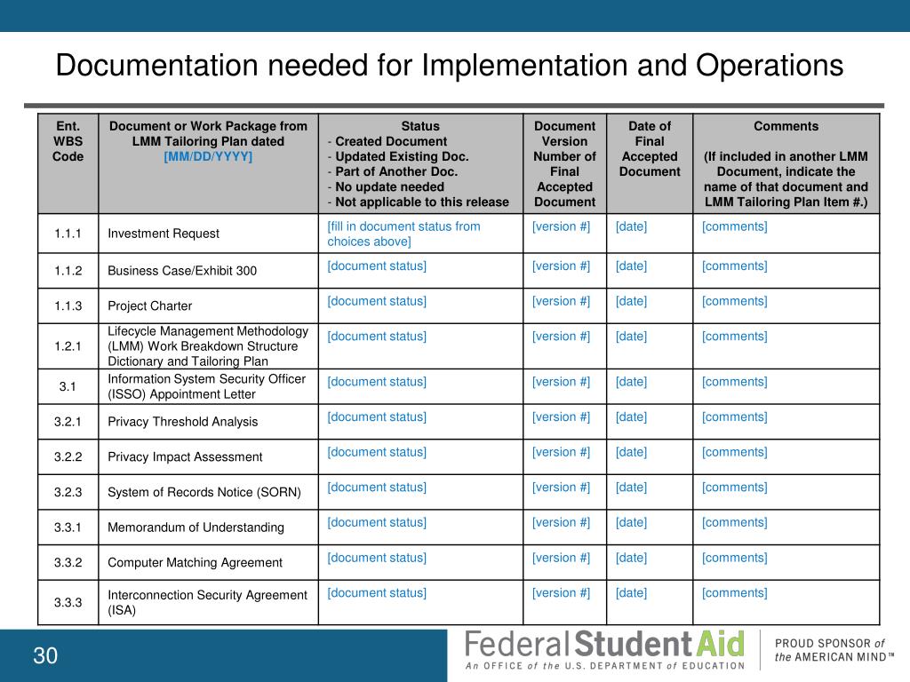 PRR Approval (Page 2 of 2) Federal Student Aid approves implementation of [System / Release Name and Version] on [implementation date]based on the information included in this Production Readiness Review. • ___________________________________ ___________________________________ • Mike Rockis, Trey Wiesenburg, or designee Sandy England, Jim McMahon, • Enterprise Quality Assurance Program Ganesh Reddy, Leslie Willoughby or designee • Technology Office Management • Based on the operational risk associated with implementation of this release, sign-off by FSA Senior Management may be required as indicated below. Factors considered in determining operational risk include system criticality, end-user type and volume, release complexity, release size, technology used by the release, implementation team maturity, and timing of the release implementation within the business cycle. • Determination by Enterprise Quality Assurance Program: • Senior Management Sign-off is required. • Senior Management Sign-off is not required. • ___________________________________ ___________________________________ • [Name of Operating Committee Member] Richard Gordon or designee • [Title of Operating Committee Member]FSA Chief Information Officer