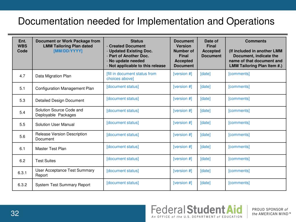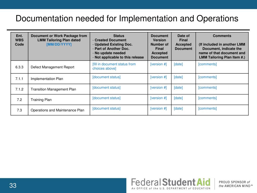 Lessons Learned • [Describe how lessons learned were captured for this release.] • A lessons learned meeting [is/is not] planned for [date/if not planned, explain approach for eliciting lessons]. • Lessons Learned for this release will be entered in FSA’s Lessons Learned Database on or before [date]. [Note: This slide should inform readers of the process for identifying and capturing lessons learned. It should not include the specific lessons.]