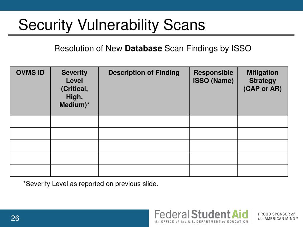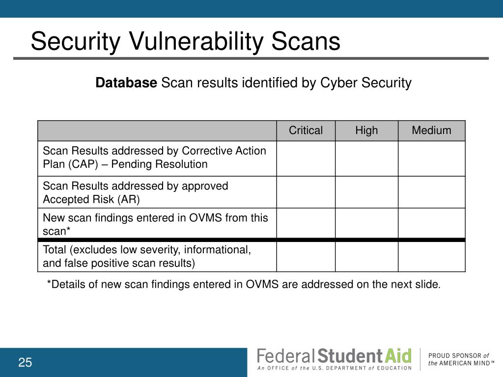 Security Vulnerability Scans Database Scan results identified by Cyber Security *Details of new scan findings entered in OVMS are addressed on the next slide.