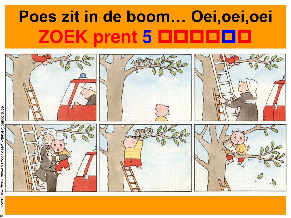 Poes is gered. STOP. KIJK GOED naar de prenten. 1. 2. 3. 4. 5. 6. Poes zit in de boom… Oei,oei,oei ZOEK prent 1 p ppppp. GOED GEZIEN. Poes zit in de boom… Oei,oei,oei ZOEK prent 2 p p pppp. GOED GEZIEN. Poes zit in de boom… Oei,oei,oei ZOEK prent 3 pp p ppp. GOED GEZIEN.