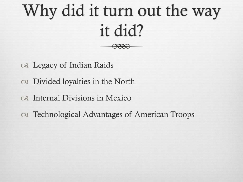 Why did it turn out the way it did? Legacy of Indian Raids Divided loyalties in the North Internal Divisions in Mexico Technological Advantages of American Troops