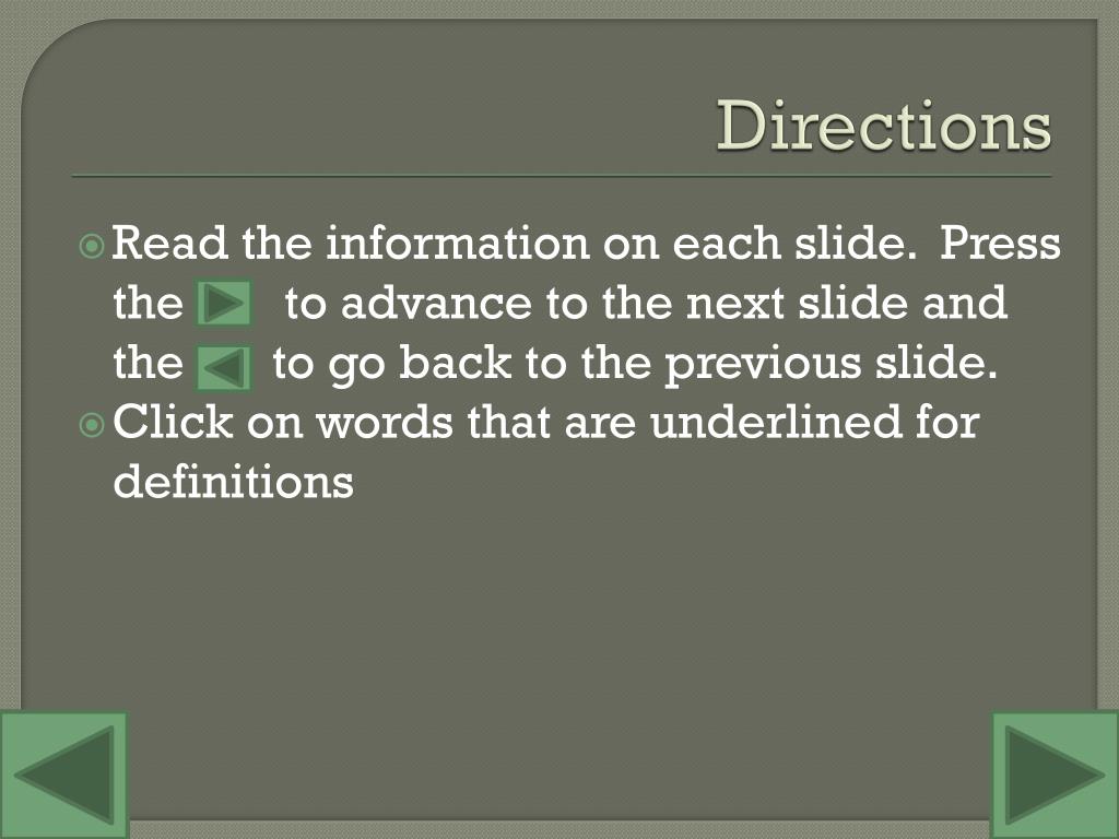 Directions Read the information on each slide. Press the to advance to the next slide and the to go back to the previous slide. Click on words that are underlined for definitions