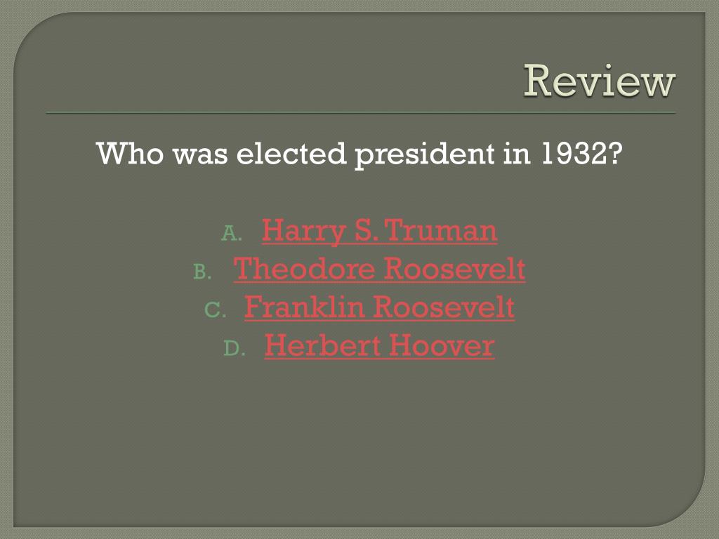 Review Who was elected president in 1932? Harry S. Truman Theodore Roosevelt Franklin Roosevelt Herbert Hoover