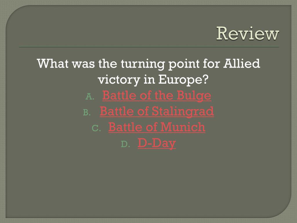 Review What was the turning point for Allied victory in Europe? Battle of the Bulge Battle of Stalingrad Battle of Munich D-Day
