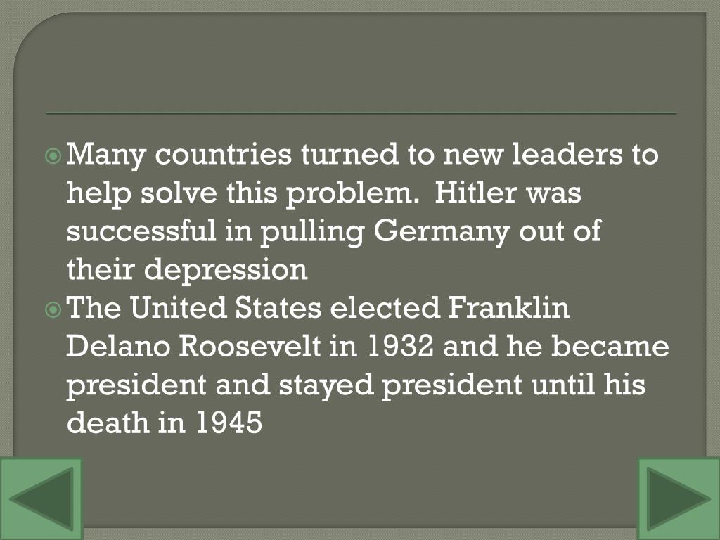 Many countries turned to new leaders to help solve this problem. Hitler was successful in pulling Germany out of their depression The United States elected Franklin Delano Roosevelt in 1932 and he became president and stayed president until his death in 1945