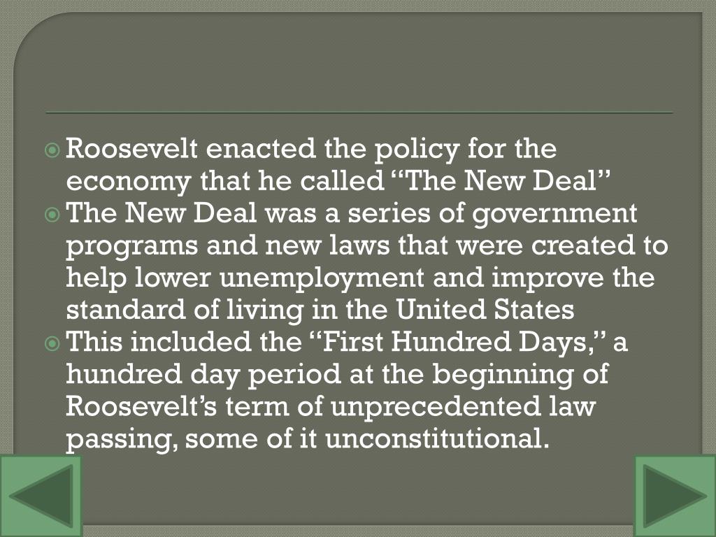 Roosevelt enacted the policy for the economy that he called “The New Deal” The New Deal was a series of government programs and new laws that were created to help lower unemployment and improve the standard of living in the United States This included the “First Hundred Days,” a hundred day period at the beginning of Roosevelt’s term of unprecedented law passing, some of it unconstitutional.