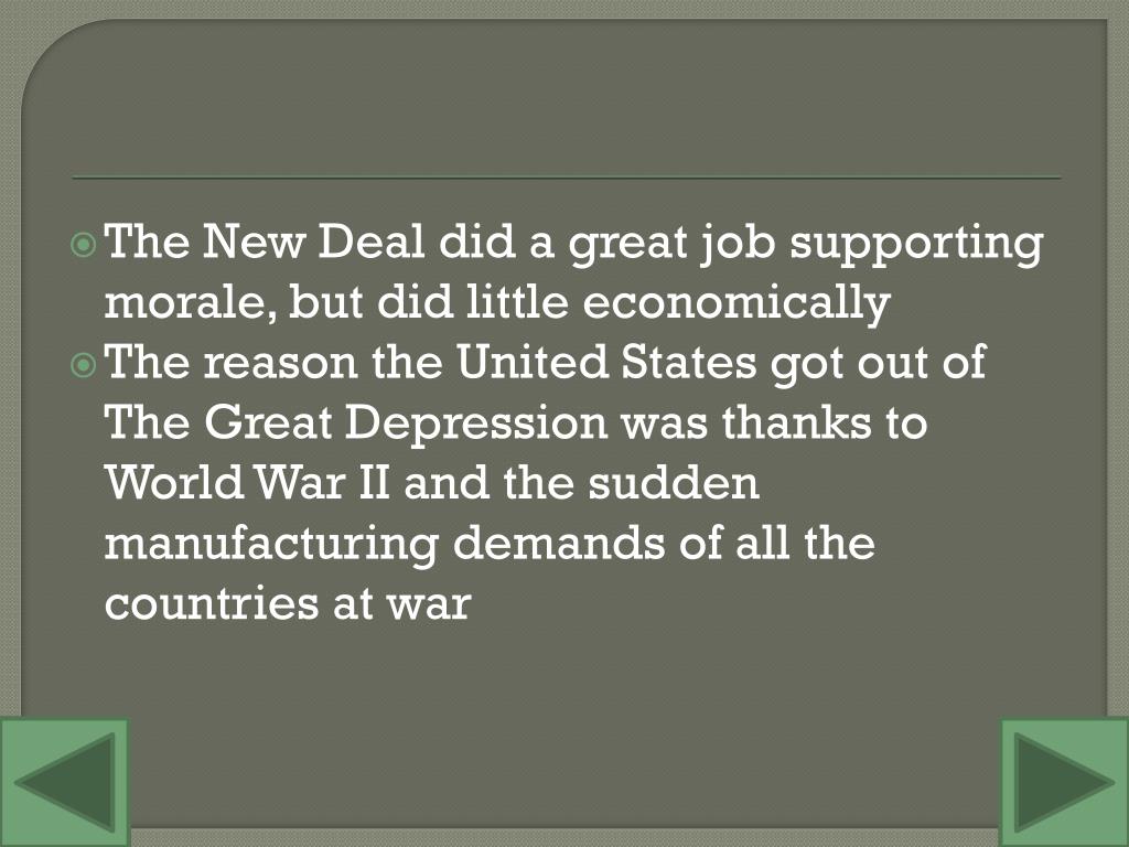 The New Deal did a great job supporting morale, but did little economically The reason the United States got out of The Great Depression was thanks to World War II and the sudden manufacturing demands of all the countries at war