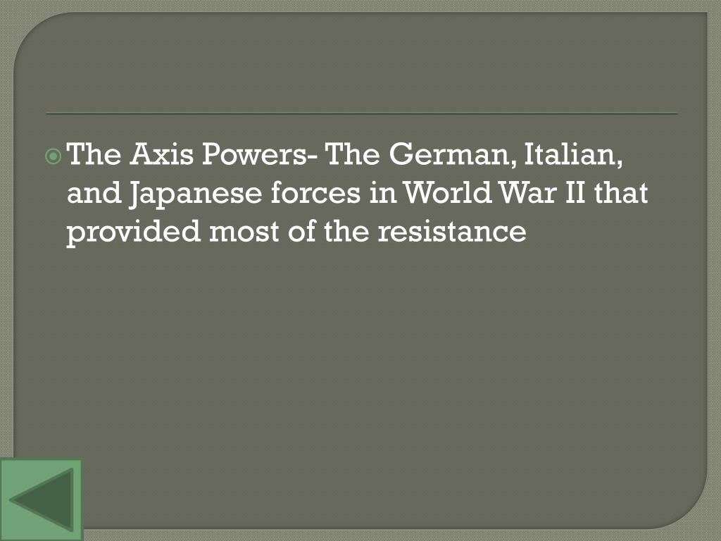 The Axis Powers- The German, Italian, and Japanese forces in World War II that provided most of the resistance