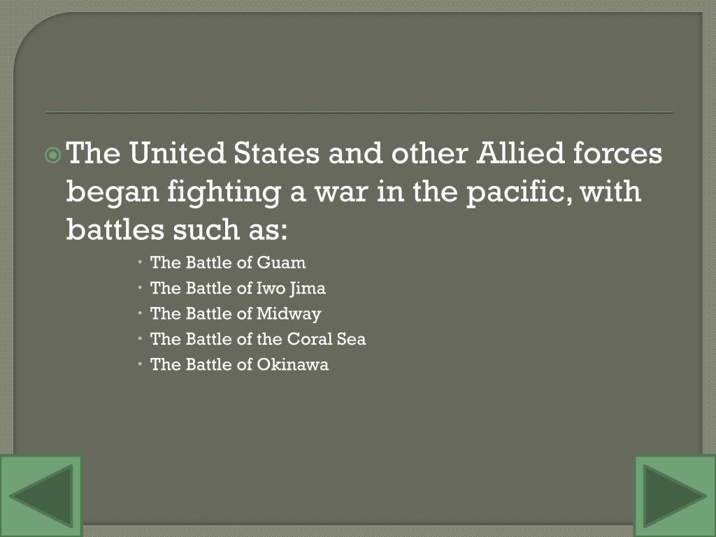 The United States and other Allied forces began fighting a war in the pacific, with battles such as: • The Battle of Guam • The Battle of Iwo Jima • The Battle of Midway • The Battle of the Coral Sea • The Battle of Okinawa