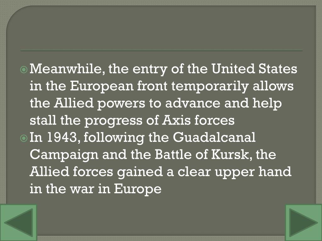 Meanwhile, the entry of the United States in the European front temporarily allows the Allied powers to advance and help stall the progress of Axis forces In 1943, following the Guadalcanal Campaign and the Battle of Kursk, the Allied forces gained a clear upper hand in the war in Europe