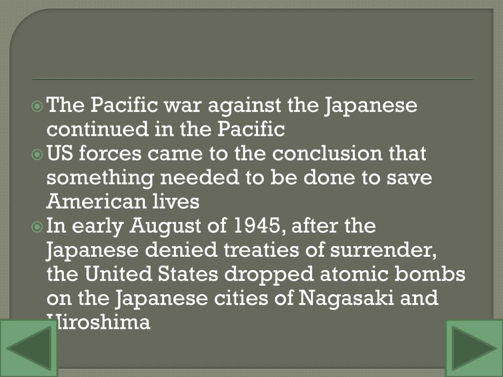 The Pacific war against the Japanese continued in the Pacific US forces came to the conclusion that something needed to be done to save American lives In early August of 1945, after the Japanese denied treaties of surrender, the United States dropped atomic bombs on the Japanese cities of Nagasaki and Hiroshima