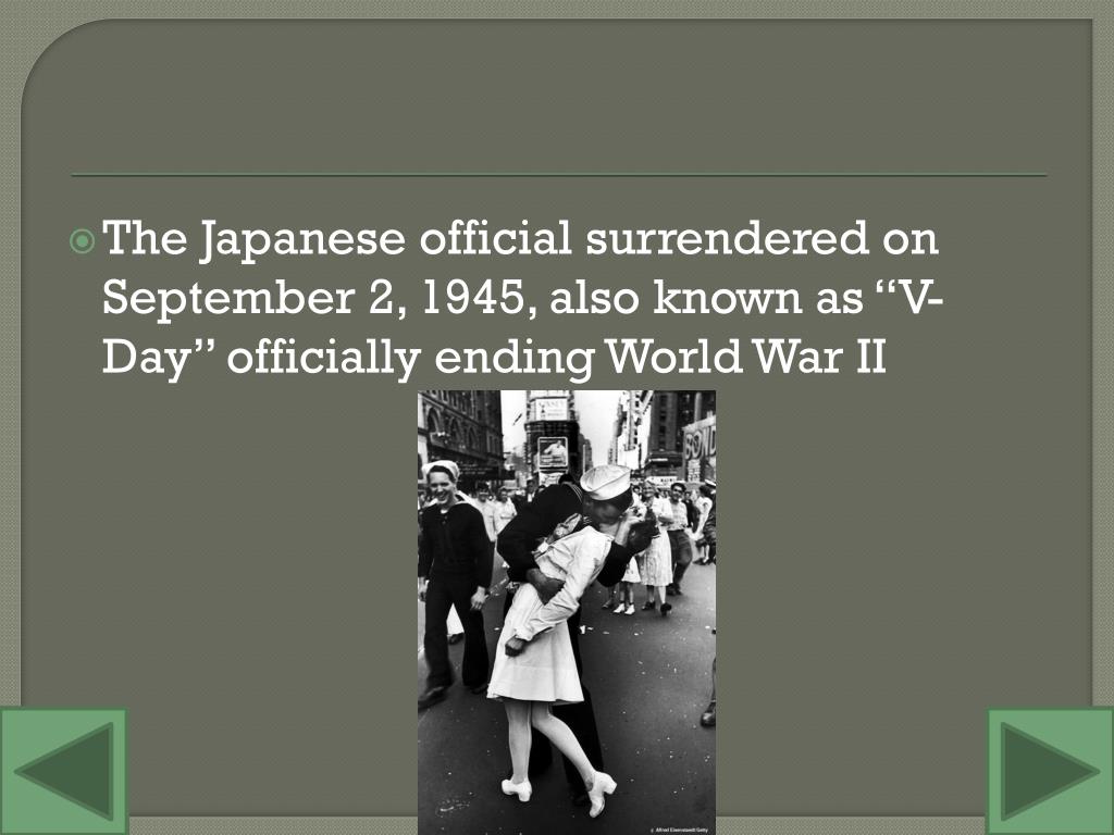 The Japanese official surrendered on September 2, 1945, also known as “V-Day” officially ending World War II