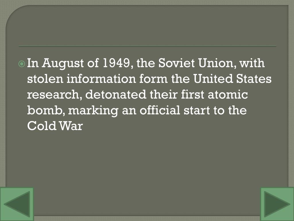 In August of 1949, the Soviet Union, with stolen information form the United States research, detonated their first atomic bomb, marking an official start to the Cold War