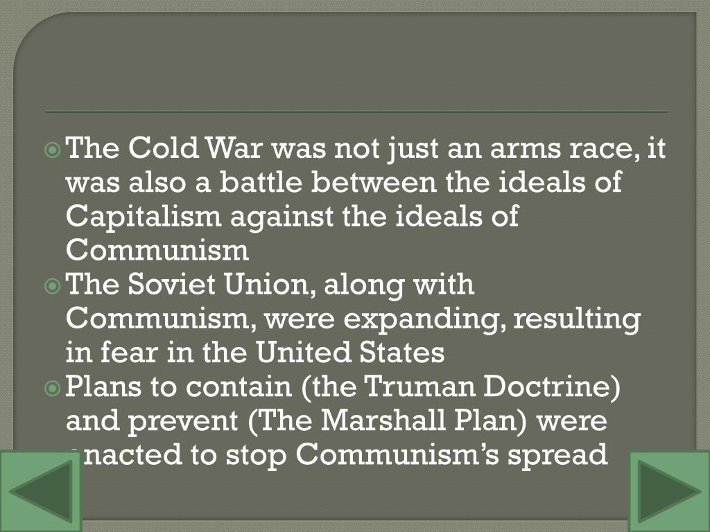 The Cold War was not just an arms race, it was also a battle between the ideals of Capitalism against the ideals of Communism The Soviet Union, along with Communism, were expanding, resulting in fear in the United States Plans to contain (the Truman Doctrine) and prevent (The Marshall Plan) were enacted to stop Communism’s spread