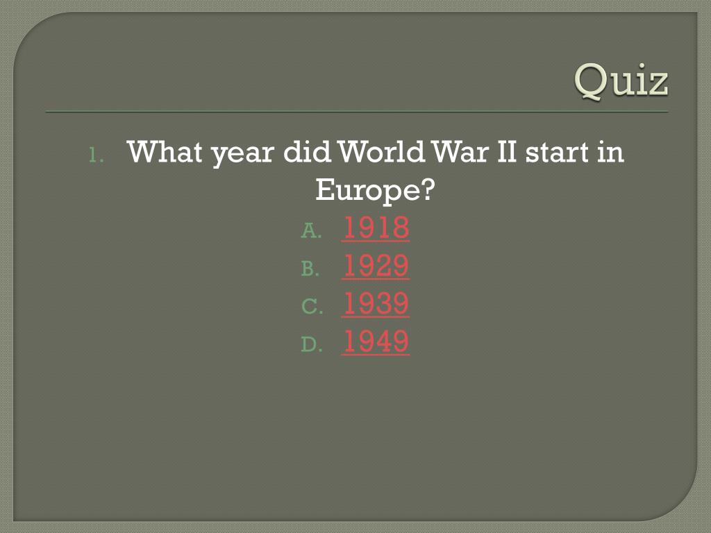 Quiz What year did World War II start in Europe? 1918 1929 1939 1949