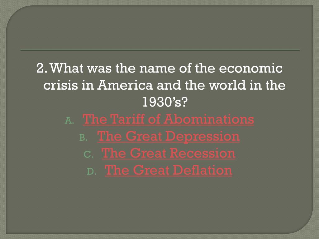 2. What was the name of the economic crisis in America and the world in the 1930’s? The Tariff of Abominations The Great Depression The Great Recession The Great Deflation