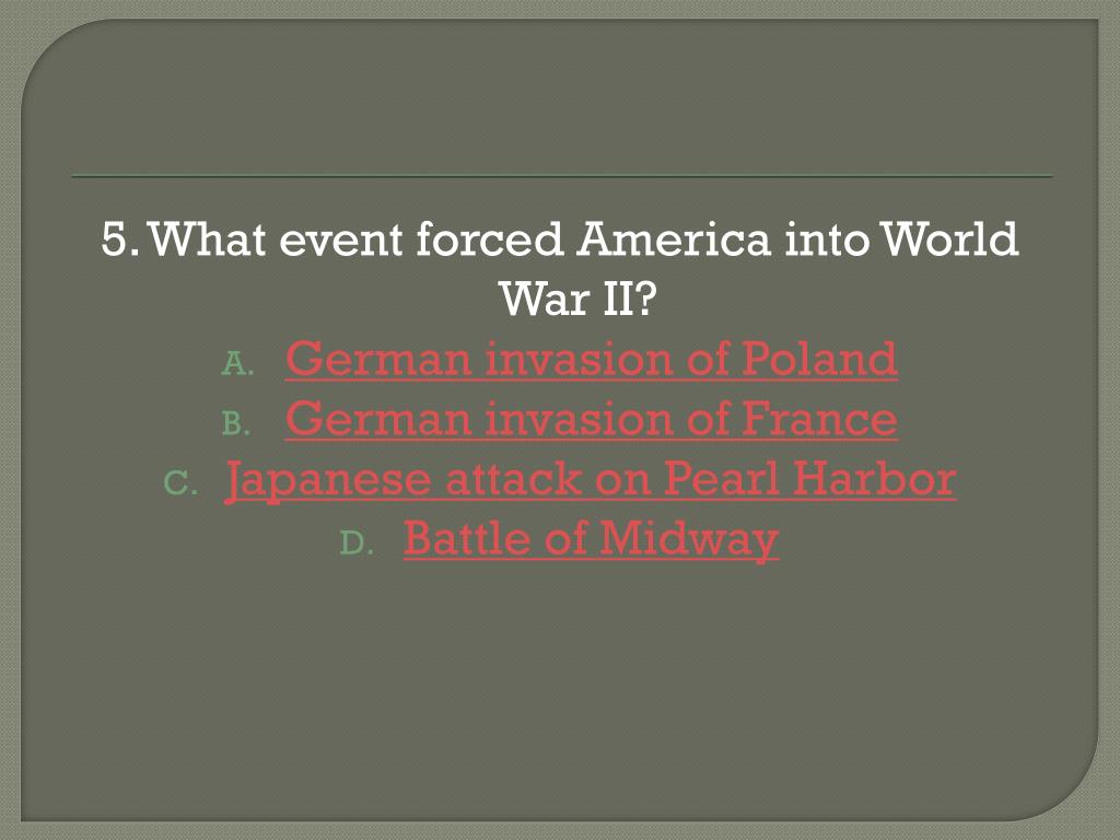 5. What event forced America into World War II? German invasion of Poland German invasion of France Japanese attack on Pearl Harbor Battle of Midway